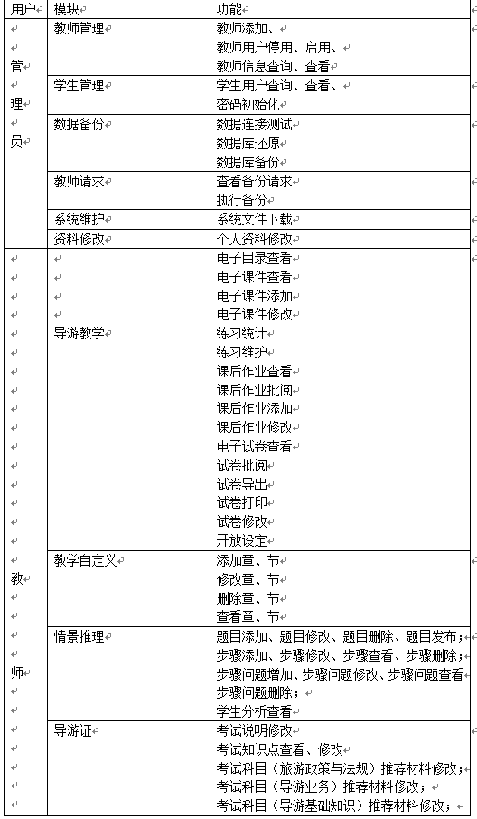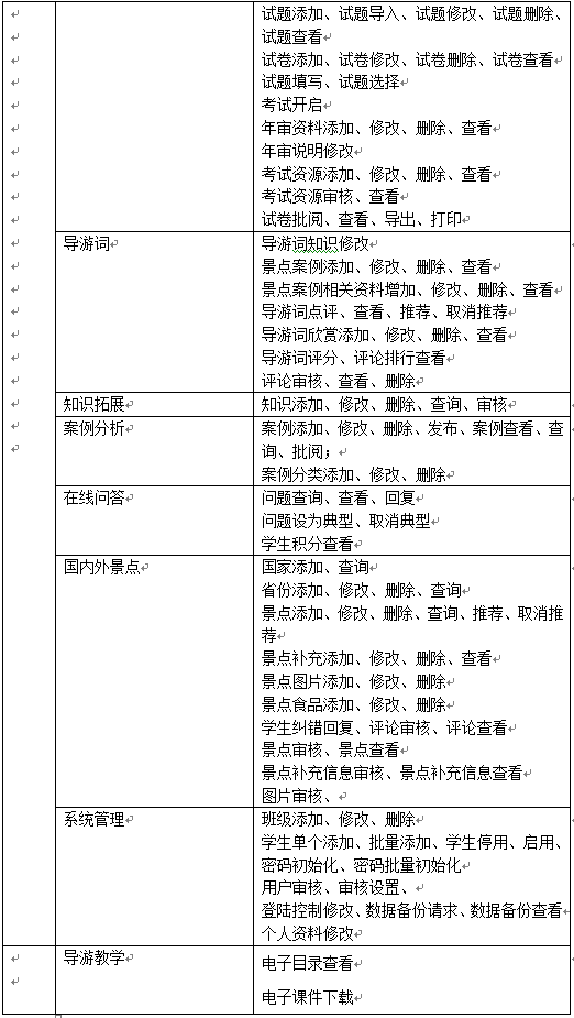 教師主要功能包括班級學生(sheng)管(guan)(guan)(guan)(guan)理(li)、導(dao)(dao)游(you)(you)基礎知(zhi)識(shi)管(guan)(guan)(guan)(guan)理(li)、國內(nei)導(dao)(dao)游(you)(you)知(zhi)識(shi)管(guan)(guan)(guan)(guan)理(li)、國外導(dao)(dao)游(you)(you)知(zhi)識(shi)管(guan)(guan)(guan)(guan)理(li)、情景題目管(guan)(guan)(guan)(guan)理(li)、導(dao)(dao)游(you)(you)證(zheng)考試(shi)資料管(guan)(guan)(guan)(guan)理(li)、模擬考試(shi)、導(dao)(dao)游(you)(you)詞管(guan)(guan)(guan)(guan)理(li)、導(dao)(dao)游(you)(you)案例(li)管(guan)(guan)(guan)(guan)理(li)、知(zhi)識(shi)拓展、案例(li)分(fen)析管(guan)(guan)(guan)(guan)理(li)、在線問答(da)、國內(nei)外景點(dian)信息管(guan)(guan)(guan)(guan)理(li)等(deng)。