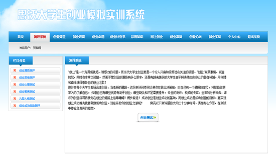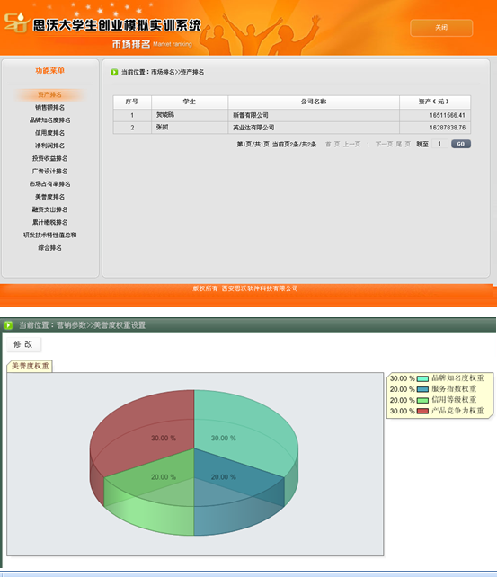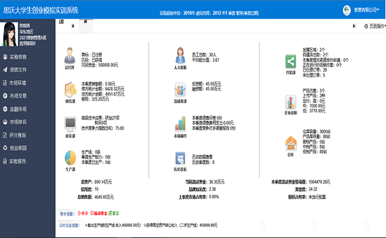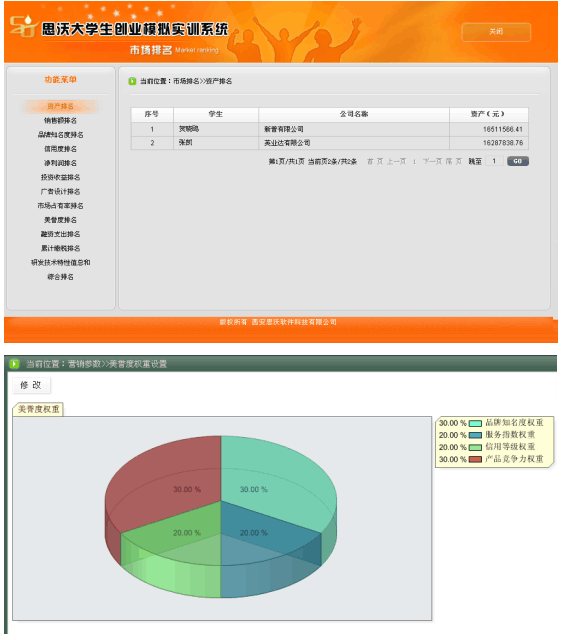 思沃大(da)學(xue)(xue)生(sheng)(sheng)創(chuang)(chuang)(chuang)(chuang)(chuang)業(ye)(ye)(ye)(ye)模(mo)擬(ni)(ni)實(shi)(shi)訓平臺系統從大(da)學(xue)(xue)生(sheng)(sheng)創(chuang)(chuang)(chuang)(chuang)(chuang)業(ye)(ye)(ye)(ye)的(de)(de)現(xian)狀分析(xi),將創(chuang)(chuang)(chuang)(chuang)(chuang)業(ye)(ye)(ye)(ye)教育(yu)的(de)(de)內容(rong)(rong)以(yi)及因素(su)滲(shen)透在(zai)專業(ye)(ye)(ye)(ye)實(shi)(shi)踐教學(xue)(xue)中(zhong),并根據創(chuang)(chuang)(chuang)(chuang)(chuang)業(ye)(ye)(ye)(ye)教育(yu)的(de)(de)目標及內容(rong)(rong)設置較完善(shan)的(de)(de)創(chuang)(chuang)(chuang)(chuang)(chuang)業(ye)(ye)(ye)(ye)實(shi)(shi)踐體系。軟件模(mo)擬(ni)(ni)交互思想,采用國(guo)際(ji)先進(jin)的(de)(de)計(ji)算機仿真技(ji)術,仿真模(mo)擬(ni)(ni)虛擬(ni)(ni)市(shi)場環境、市(shi)場調(diao)查(cha)以(yi)及整(zheng)個市(shi)場競爭結構。學(xue)(xue)生(sheng)(sheng)通過(guo)軟件學(xue)(xue)習創(chuang)(chuang)(chuang)(chuang)(chuang)業(ye)(ye)(ye)(ye)心理學(xue)(xue)、創(chuang)(chuang)(chuang)(chuang)(chuang)業(ye)(ye)(ye)(ye)講堂、網上(shang)創(chuang)(chuang)(chuang)(chuang)(chuang)業(ye)(ye)(ye)(ye)、創(chuang)(chuang)(chuang)(chuang)(chuang)業(ye)(ye)(ye)(ye)準(zhun)備(bei)等創(chuang)(chuang)(chuang)(chuang)(chuang)業(ye)(ye)(ye)(ye)知識(shi),撰寫(xie)一份(fen)創(chuang)(chuang)(chuang)(chuang)(chuang)業(ye)(ye)(ye)(ye)計(ji)劃書,投入到創(chuang)(chuang)(chuang)(chuang)(chuang)業(ye)(ye)(ye)(ye)實(shi)(shi)戰(zhan)中(zhong)。創(chuang)(chuang)(chuang)(chuang)(chuang)業(ye)(ye)(ye)(ye)實(shi)(shi)戰(zhan)分為公(gong)(gong)司(si)注(zhu)(zhu)冊和(he)實(shi)(shi)戰(zhan)運(yun)營。公(gong)(gong)司(si)注(zhu)(zhu)冊采用Flash動畫模(mo)式,模(mo)擬(ni)(ni)公(gong)(gong)司(si)注(zhu)(zhu)冊的(de)(de)整(zheng)個流程(cheng)(cheng)。實(shi)(shi)戰(zhan)運(yun)營是整(zheng)個系統的(de)(de)主體,將全國(guo)分為七個區(qu)(qu)(qu)域(yu):東北地(di)(di)區(qu)(qu)(qu)、華北地(di)(di)區(qu)(qu)(qu)、西北地(di)(di)區(qu)(qu)(qu)、華東地(di)(di)區(qu)(qu)(qu)、西南(nan)地(di)(di)區(qu)(qu)(qu)、華中(zhong)地(di)(di)區(qu)(qu)(qu)、華南(nan)地(di)(di)區(qu)(qu)(qu)。系統模(mo)擬(ni)(ni)公(gong)(gong)司(si)內部與(yu)(yu)外在(zai)市(shi)場之間(jian)的(de)(de)矛盾,創(chuang)(chuang)(chuang)(chuang)(chuang)業(ye)(ye)(ye)(ye)者通過(guo)各種調(diao)查(cha)、決(jue)策(ce)解(jie)決(jue)企(qi)業(ye)(ye)(ye)(ye)市(shi)場運(yun)營過(guo)程(cheng)(cheng)中(zhong)可能遇到的(de)(de)各種情況。在(zai)區(qu)(qu)(qu)域(yu)需求飽和(he)后擴(kuo)大(da)市(shi)場,對其中(zhong)出現(xian)的(de)(de)問題和(he)運(yun)營結果進(jin)行分析(xi)與(yu)(yu)評估,培養大(da)學(xue)(xue)生(sheng)(sheng)正確的(de)(de)人生(sheng)(sheng)觀、價值觀、就業(ye)(ye)(ye)(ye)觀,提(ti)高大(da)學(xue)(xue)生(sheng)(sheng)勇于創(chuang)(chuang)(chuang)(chuang)(chuang)業(ye)(ye)(ye)(ye)的(de)(de)精神,讓(rang)大(da)學(xue)(xue)生(sheng)(sheng)有良好的(de)(de)創(chuang)(chuang)(chuang)(chuang)(chuang)業(ye)(ye)(ye)(ye)意識(shi),增強大(da)學(xue)(xue)生(sheng)(sheng)自主創(chuang)(chuang)(chuang)(chuang)(chuang)業(ye)(ye)(ye)(ye)能力(li)。